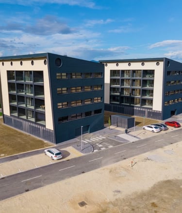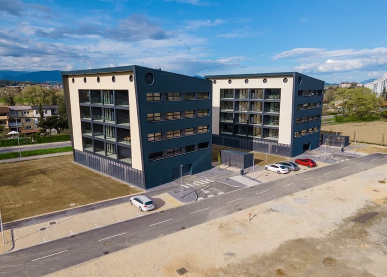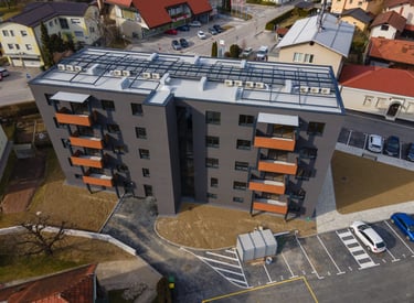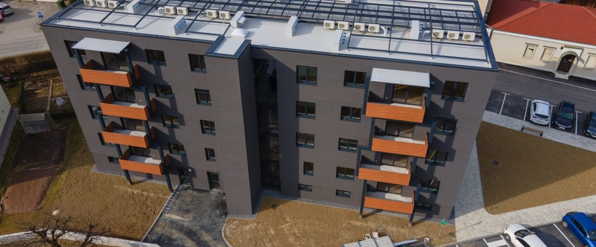 Dva vila bloka s štirimi etažami in garažno hišo v pritličju. Sodobna stanovanjska soseska na zelenem območju Medlog v Celju, kjer je nekoč domovala mlekarna, bo skupaj obsegala šest stanovanjskih zgradb. Uredili smo tudi vso potrebno infrastrukturo in poskrbeli za zunanjo ureditev s kolesarnico.